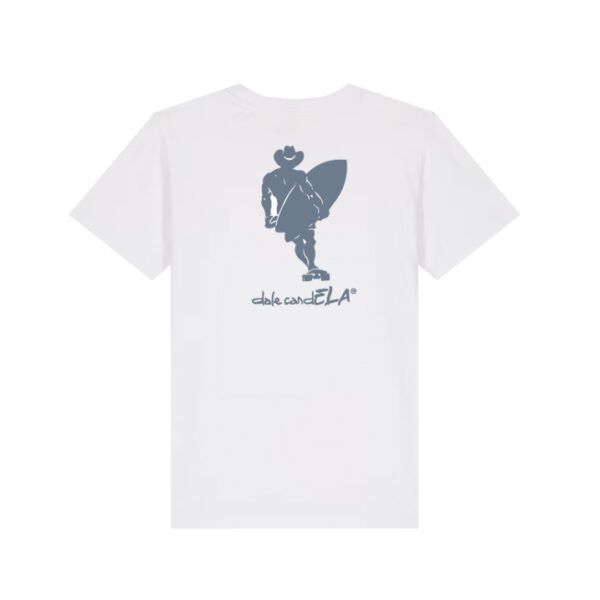 Camiseta niño blanca con dibujo VAQUERO sobre SKATE en la espalda.
