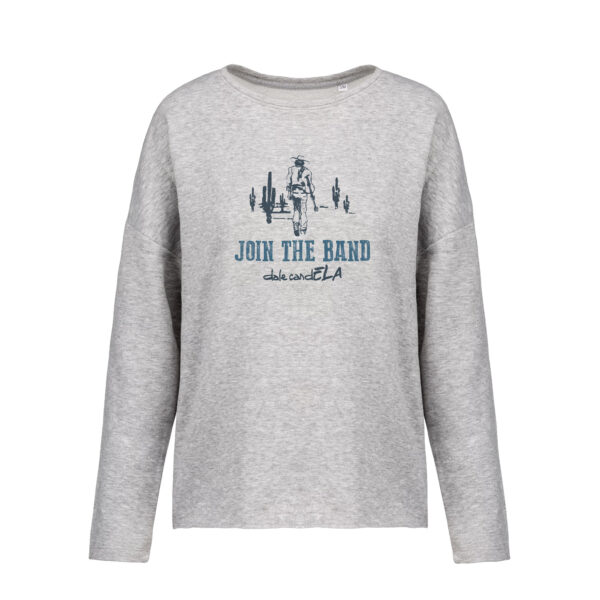 Sudadera mujer gris con vaquero y lema «Join the Band» en la parte delantera.