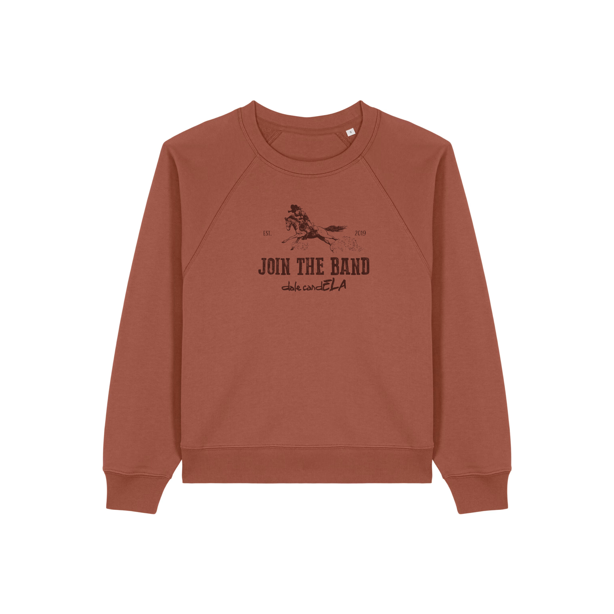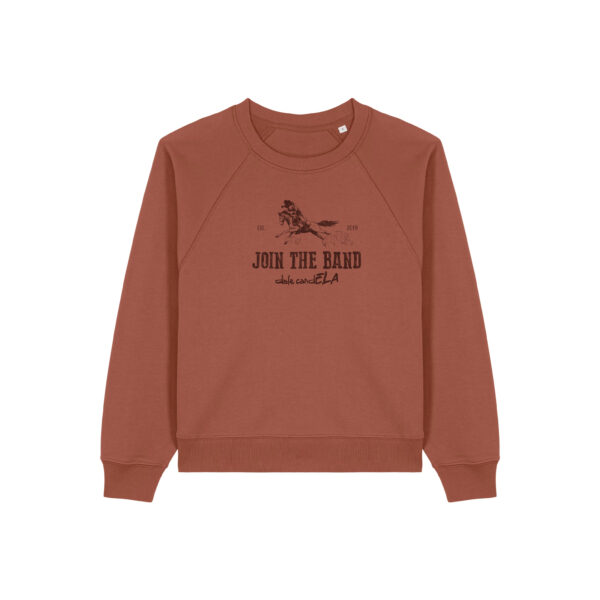 Sudadera mujer teja con serigrafia «Join the Band» y dibujo de vaquero a caballo.