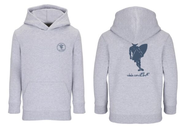 Sudadera de niño gris con capucha y serigrafía skate en la espalda.
