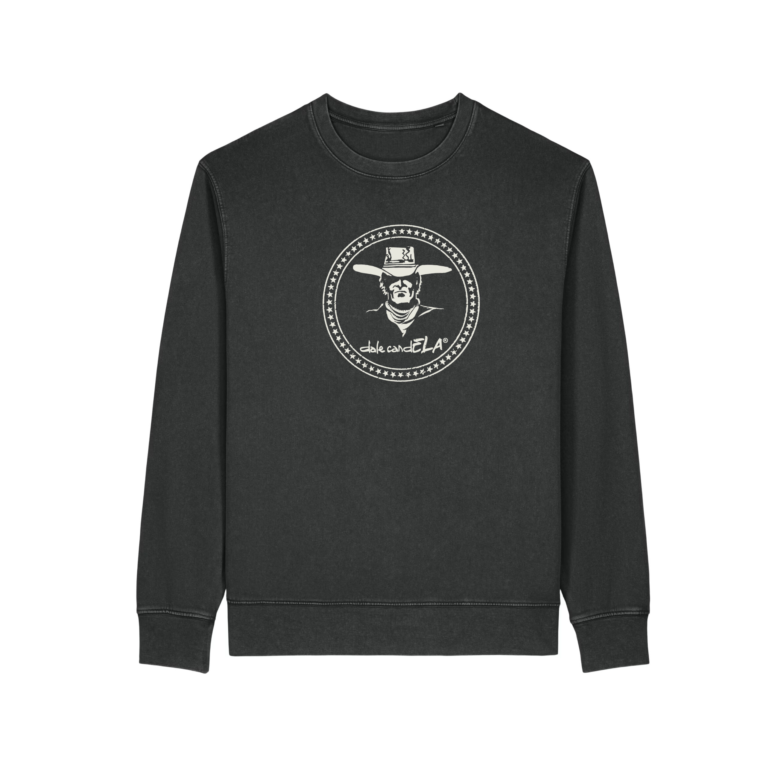Sudadera unisex negra lavada con logo vaquero en la parte delantera.